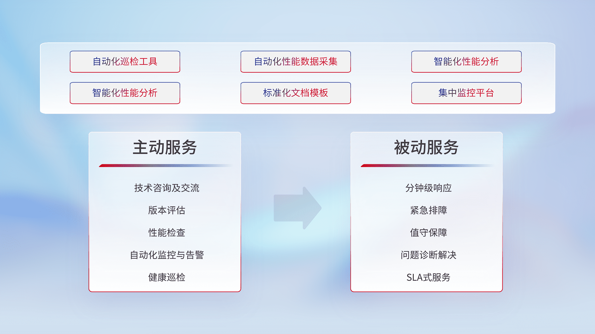智能化工具和标准化文档,,,,保障服务质量,,,,提供主动服务(包含技术咨询、、、、版本评估、、、性能检查、、、、自动化监控与告警、、、、健康巡检)和被动服务包含(分钟级响应、、、紧急排障、、、、值守保障、、问题诊断解决、、、、SLA服务)。。