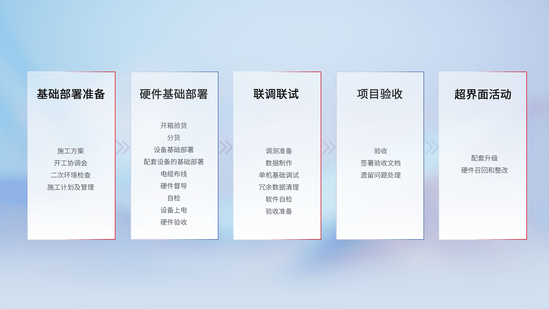 从基础部署准备、、、硬件基础部署、、、、联调联试、、项目验收、、越界面活动的全过程可追溯,,,保证施工质量和进度。。。。